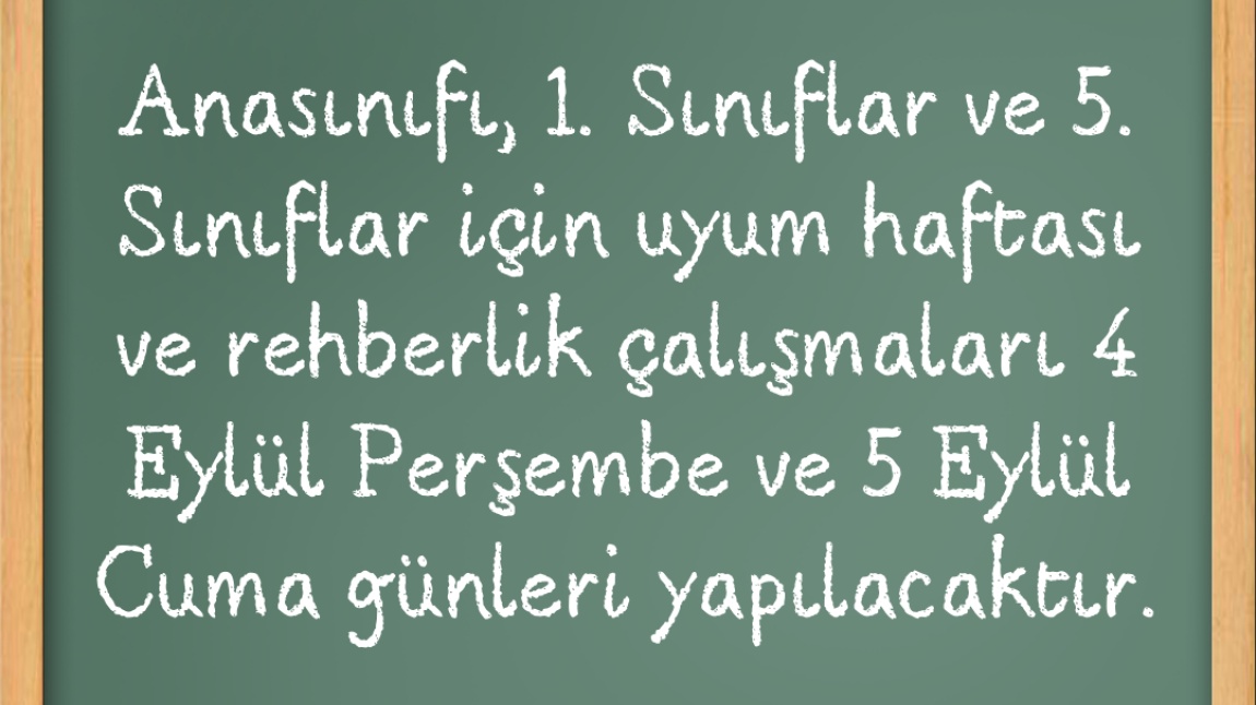 Anasınıfı, 1. Sınıflar ve 5. Sınıflar için uyum haftası ve rehberlik çalışmaları 4 Eylül Perşembe ve 5 Eylül Cuma günleri yapılacaktır.